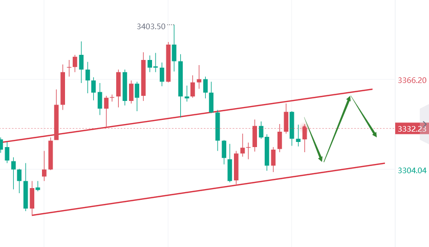 K 线组合形态方面,近期 K 线呈现连续小实体蜡烛线排列,价格波幅逐步收窄,形成典型的横盘整理形态。当前价格在 3340反复震荡,多空双方在此价位展开激烈争夺。布林带中轨位于 3300 ,构成重要支撑防线;布林带上轨与下轨分别位于 3410 与 3190 ,共同勾勒出短期价格波动区间。