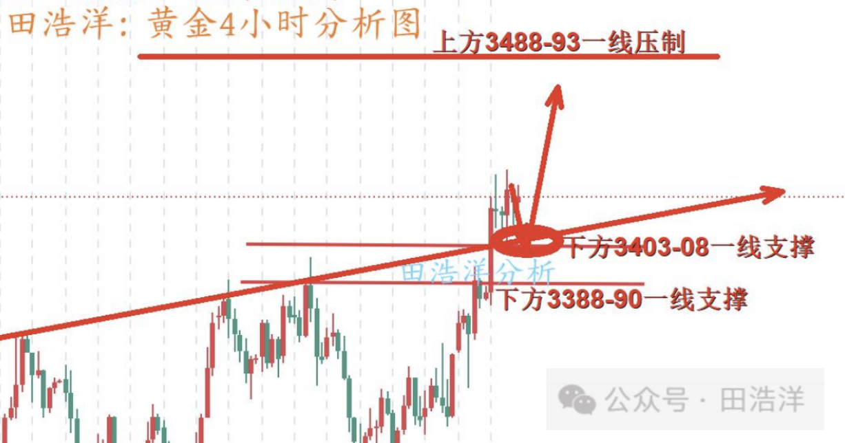 从4小时分析来看,下方短期支撑关注3403-08一线,下方重点支撑关注近期顶底转换位3375-80附近,日内回踩依托此位置继续主多顺势看涨不变,下周我们关注3488-93一线压制,日线级别继续保持顺势回踩做多节奏不变,逆势空单需谨慎。具体操作策略我会在盘中提示,及时关注。