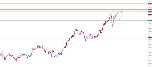 从多周期分析,首先观察月线节奏,从长线上看3130位置是长线走势的分水岭,价格在此位置之上长线多对待即可。从周线级别看,目前周线多空分水岭于3490位置,价格在此位置之上中线多对待即可。从日线级别看,暂时需要关注3735区域支撑,此位置之上波段多对待,目前继续右侧交易方式对待。从四小时上看,观察黄金上涨节奏中,价格只要没有下破四小时支撑则维持强势多,价格只有下破后才会出现调整,目前四小时支撑于3831-3832区域,所以价格在此位置之上继续多头对待。