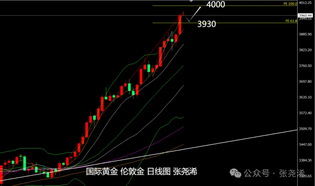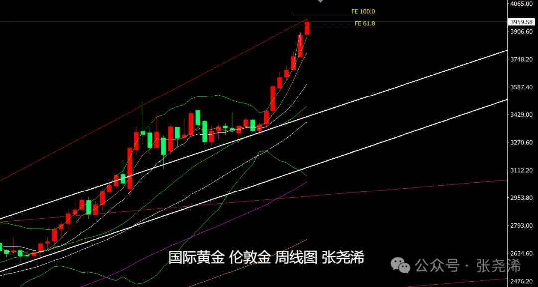 周图,金价自去年开涨攀升以来,如期第4次回踩中轨线支撑,并再度展开持续向上攀升的多头行情,不断触及给出的看涨目标位,本周也进一步触及给出的看涨目标位3970美元,依托布林带上轨支撑连续走强,当下虽冲出布林带之外,有阻力回撤风险,但根据前几周表现和指标信号来看,回撤力度也有限,整体走强趋势未有减弱迹象,多头前景良好。下方则关注扩展线支撑以及布林带上轨支撑可继续选择多单入场。