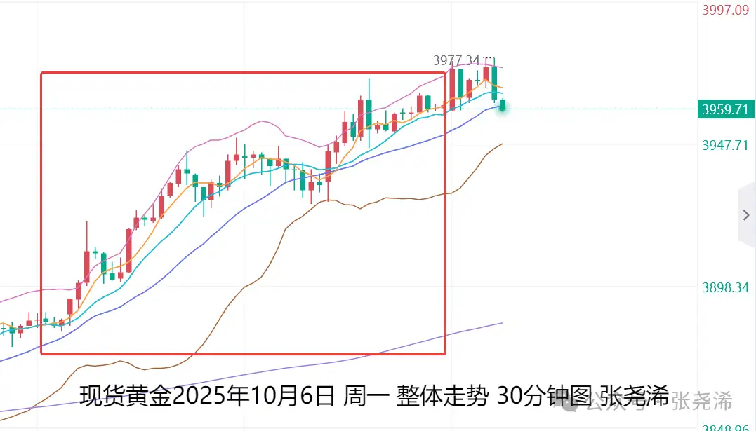 上交易日周一(10月6日):国际黄金强势反弹拉升,突破日内阻力,并触及上周给出的第一目标位3974美元,且进一步刷新历史高点,并持稳收阳,多头动力未有减弱迹象,短期将有望冲击4000美元关口或更高。