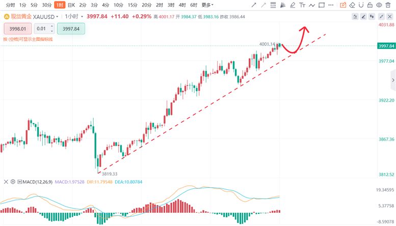 经过周一,周二的连续上涨,周三开盘,黄金已经走高至4000高点,并且轻松破位4000关口,现在说黄金的行情怎么看,显而易见,看涨不猜高,等待回落多,截至到目前为止,这个原则已经从年初贯穿到现在。周一,周二做了一波3950的多单,看到4000,现在点位已到,接下来在这种走势中看4000之上的延续性。早盘开盘先回落到3984后之恶极破位4000,那么,4000的压制点就美元整点关口的作用,也就是说不能二次做空,需要看一下欧美盘是否能出现调整后做多,按照技术面来讲,下方的支撑在3990,3975,如果全天回落空间不大,可稳健在3975附近做多,日内操作保持低多看涨思路不变。目前手上有低位的空单和高位多单不知道如何处理,张德盛可解【张德盛微信号:macd60588 钉钉号:masd1008 公众号:爱上黄金】