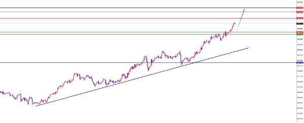 从多周期分析,首先观察月线节奏,从长线上看3130位置是长线走势的分水岭,价格在此位置之上长线多对待即可。从周线级别看,目前周线多空分水岭于3531位置,价格在此位置之上中线多对待即可。从日线级别看,暂时需要关注3837区域支撑,此位置之上波段多对待。从四小时上看,价格目前持续依托四小时支撑继续上彪,并且价格突破4000大关,随着时间的推移目前四小时支撑于3973-3983区间,价格在此位置之上继续多头对待。从一小时级别看,昨日强势收盘后,今日早盘继续强势发力,则早盘低点位置成为关键分水岭,所以整体上价格在早盘低点支撑持续看延续即可,早盘机会布局的空间还不错,如若早盘没有布局的话可以依托早盘低点看延续即可,大家合理控制仓位。