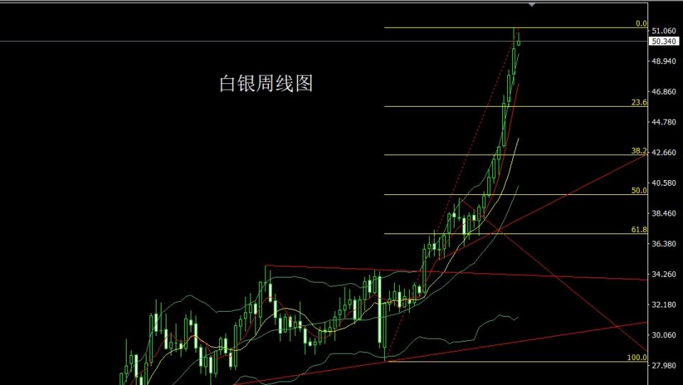 白银市场上周开盘在48.043的位置后行情先拉升给出48.766的位置后行情快速回落,周线最低给到了47.284的位置后行情强势拉升,周线最高触及到了51.266的位置后行情冲高回落,周线最终收线在了49.821的位置后行情以一根上影线稍长于下影线的大阳线收线,而这样的形态收尾后,本周市场依旧有技术看多需求,点位上,下方37.8的多和38.8的多减仓后止损跟进在44持有。44.6的多减仓后止损跟进在45持有,本周高开在50.8空止损51.1目标看49.6和49.2和49和48.7离场准备多。