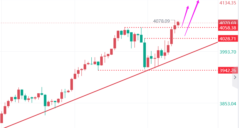 今天早盘黄金再次冲高4060,虽然未能突破,最低回落至4025附近,但在强势行情中很快又重拾升势并收在高位。这正是布局多单的好时机!激进者可在4060直接做多,稳健者建议等待4045进场。上方目标位先看4100-4200区间,更长远的目标是4500。让我们共同见证这波黄金牛市!