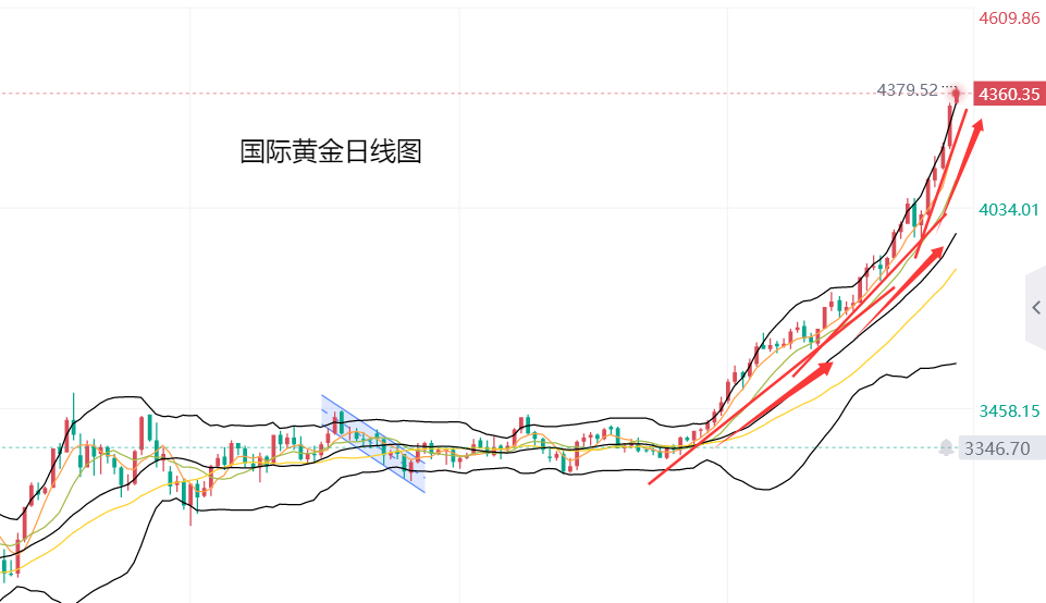 从之后的走势看,昨日周三亚盘开盘后,黄金小幅回落4199美元企稳,亚盘盘中金价上涨,刷新历史新高至4242美元,遇阻后金价震荡回落,跌至4203美元,继续企稳4200美元整数位置,欧盘开盘后,黄金震荡上涨,再创历史新高至4247美元,美盘开盘后,黄金继续冲高,涨至4298美元遇阻,此后金价频繁上探,临近收盘时,向上突破4300美元整数位置,黄金继续上涨,收盘时刷新历史新高至4330美元;周五开盘不久,黄金进一步上涨,刷新历史新高至4379美元。总体来看,黄金回落我们给出的4200美元整数支撑企稳上涨,在突破周三创造的历史高点4218美元后,黄金持续冲高,不断创造新的历史高点记录,走势基本符合我们顺势上看上不猜顶的看涨预期。