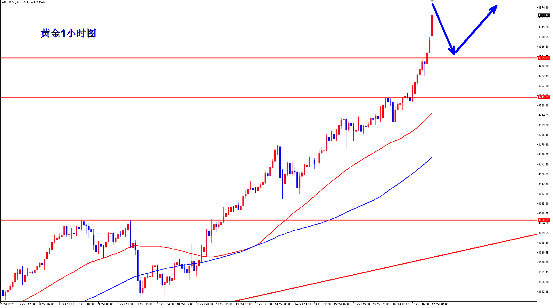 黄金现在1小时均线继续金叉向上的多头排列发散,黄金多头势不可挡,黄金现在继续突破站稳4300一线,黄金多头就是这么威武,不过黄金早盘急涨后容易急跌,所以早盘耐心等待黄金调整后继续顺势多,黄金当前4300一线关口支撑上继续逢低做多。