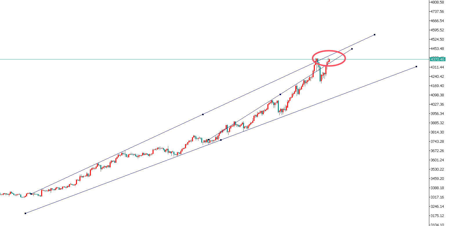 对于今天的行情来说,直接看图,在昨天日线大阳依托之下,今天仍有继续惯性冲高的动能。下方支撑且关注4340-4350区域,然而上方4405-4410一带仍是强大压力,行情仍旧看好冲高回落!