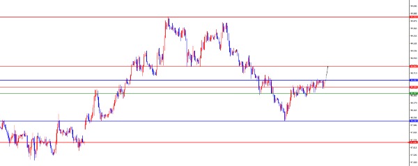 从多周期分析,周线价格经过前期持续震荡后于上周进行站稳,上周价格进行回踩周线支撑位置下跌,目前周线支撑于98区域,后续关注进一步中期多头(需要注意缺口位置)。从日线级别看,随着时间的推移目前日线阻力于98.60区域,此位置是波段走势的关键,近期价格在此位置上下盘整,短线操作需要结合小周期。从四小时上看,在近期波动过程中我们发现价格依托四小时关键位置运行,针对昨日价格突破四小时阻力,则此位置变成关键支撑,位置上暂时关注98.40-50区间,后续依托此区域进一步看上涨。一小时上看目前价格同样偏多,所以暂时先关注多头运行,上方暂时关注98.80区域阻力。