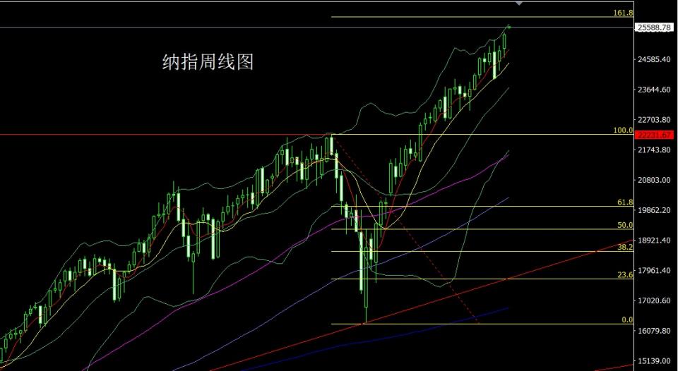 纳指市场上周高开在24922.96的位置后行情回补缺口给出24784.58的位置后行情拉升,给出25206.47的位置后行情二次回落周线最低给到了24632.71的位置后行情强势拉升,周线最高触及到了25415.72的位置后整理,周线最终收线在了25361.72的位置后,周线以一根下影线很长的大阳线收尾,而这样的形态收尾后,今日高开后回踩25400多止损25340,目标看25500和25600和25700-25750.