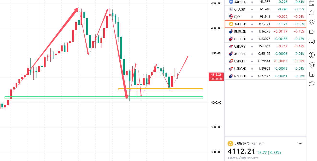 目前美政府持续停摆,一些重要数据无法公布,上周五给出的CPI参考数据是小幅利好黄金,但是实际情况目前不得而知,另外就是中美就贸易情况开启磋商,这也是会直接影响到市场情绪的消息,所以短期上次情绪不稳定,上周冲历史新高之后大幅杀跌,一度跌到4004附近企稳反抽,但是都没能延续,周五跌破4100会后跟大家分享先看延续到4048附近看反弹,都是如期兑现了,周一的话关注一下开盘情况,有效企稳4100继续看多头延续,反之关注二次探底情况了,行情正好,需要跟上笔者实时建仓节奏的朋友可以从笔者财经号简介找到我!