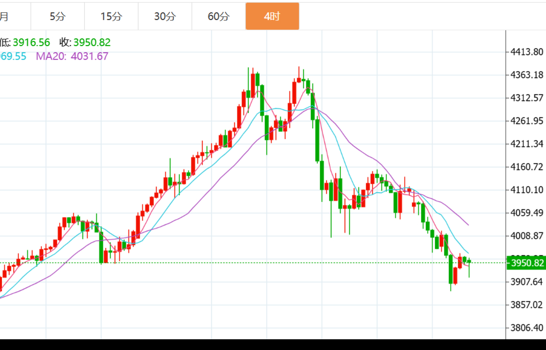 具体走势上,金价自亚市低开于4078.89美元/盎司,迅速收复缺口录得日内高点4108.76 美元,之后遇阻回落,持续震荡走低,延续至美盘23点时段录得日内低点3971.36美元,最后有所止跌触底回升,并维持3980美元上方震荡盘整,最终收于3981.20美元,日振幅137.4美元,相对于上周五收盘价4108.63美元,收跌127.43美元,跌幅3.1%。