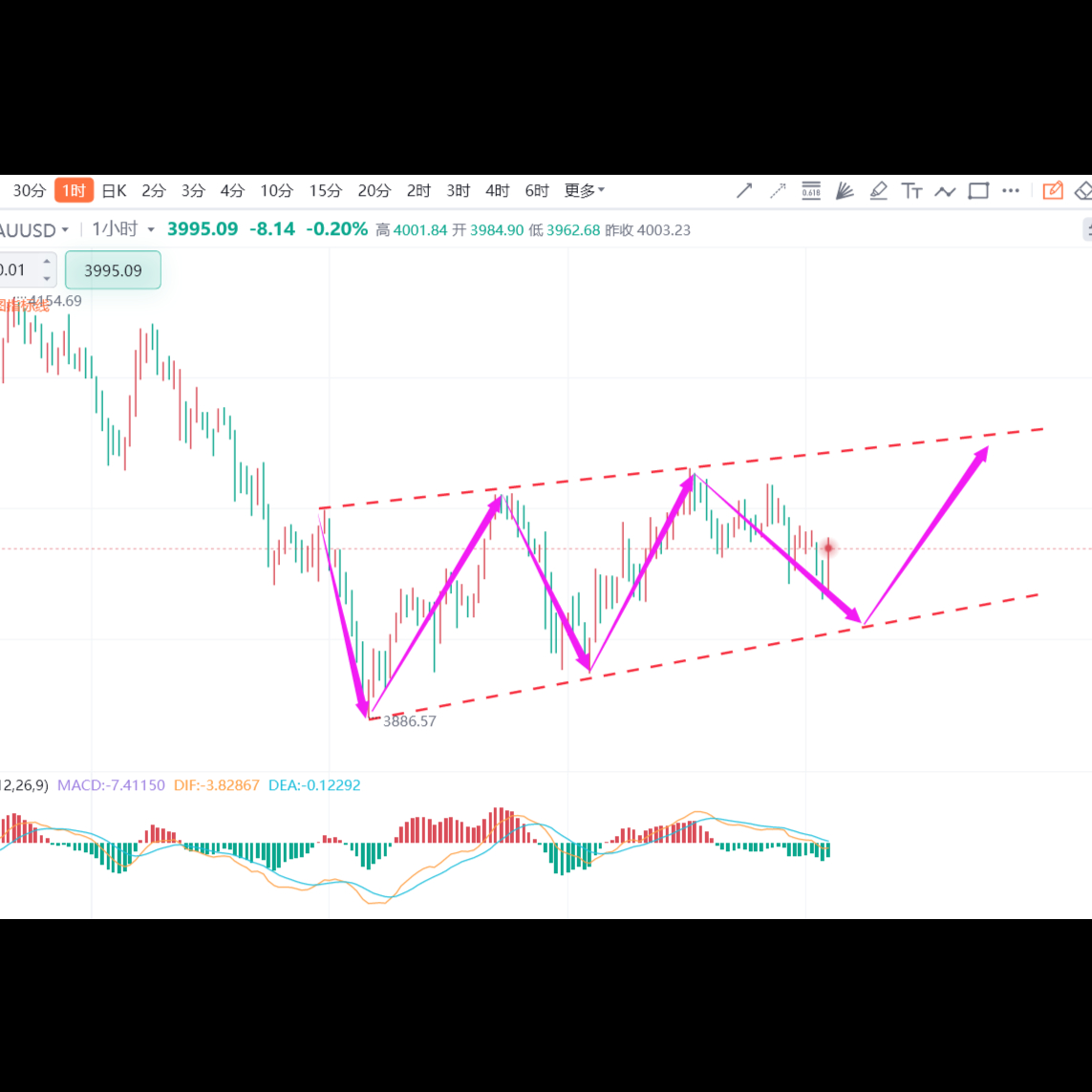 而对于当前的黄金来说,属于日线级别的盘整震荡走势,下方平台极限支撑是3850位置,而当前的下跌仅仅只有两波,而且下跌并没有出现背离的情况,所以修正过后还将继续下行,至少是再次测试3900乃至于3850区域!所以下周依旧是抓住下一个浪形下跌!