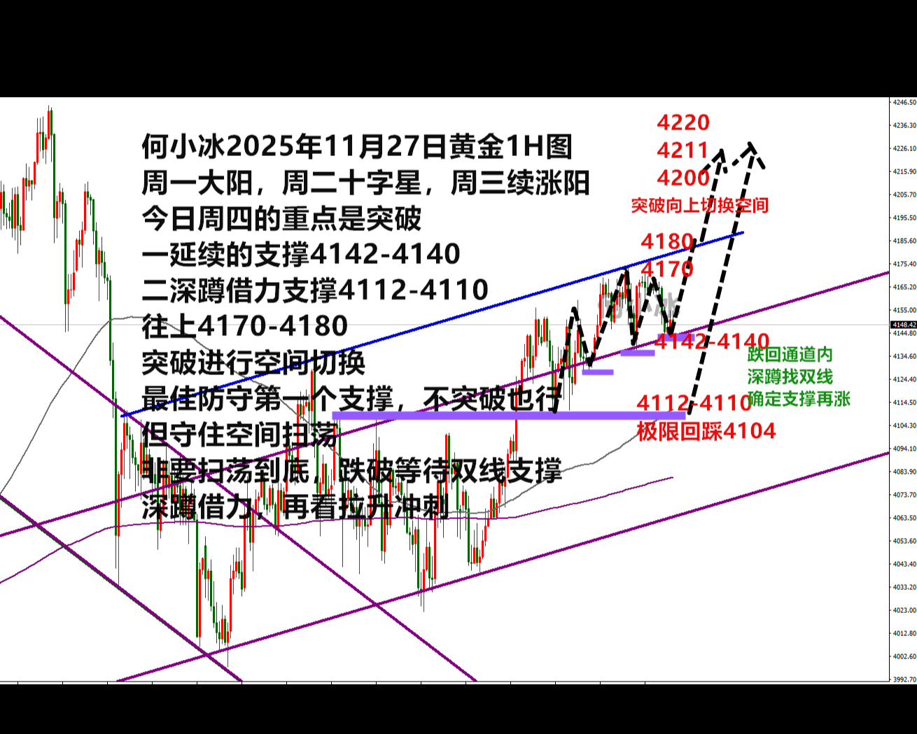 消息面:周三数据显示,截至11月22日当周,初请失业金人数减少6,000人至216,000人,为4月以来最低。经济学家原预期为225,000人。美国9月份耐用品订单环比增速从8月份的3%降至0.5%,但仍高于经济学家此前预测的0.3%。剔除运输和国防等波动较大的项目后,耐用品订单环比增长0.9%,远超此前0.2%的预期。黄金价格在周四亚洲时段出现回落,主要反映市场风险偏好改善以及节假日交投清淡下的避险需求降温。随着市场对美联储12月可能再度降息的预期升温,加上外界对地区和平谈判的期待提升,全球市场情绪趋向乐观,促使部分资金从黄金流向风险资产。