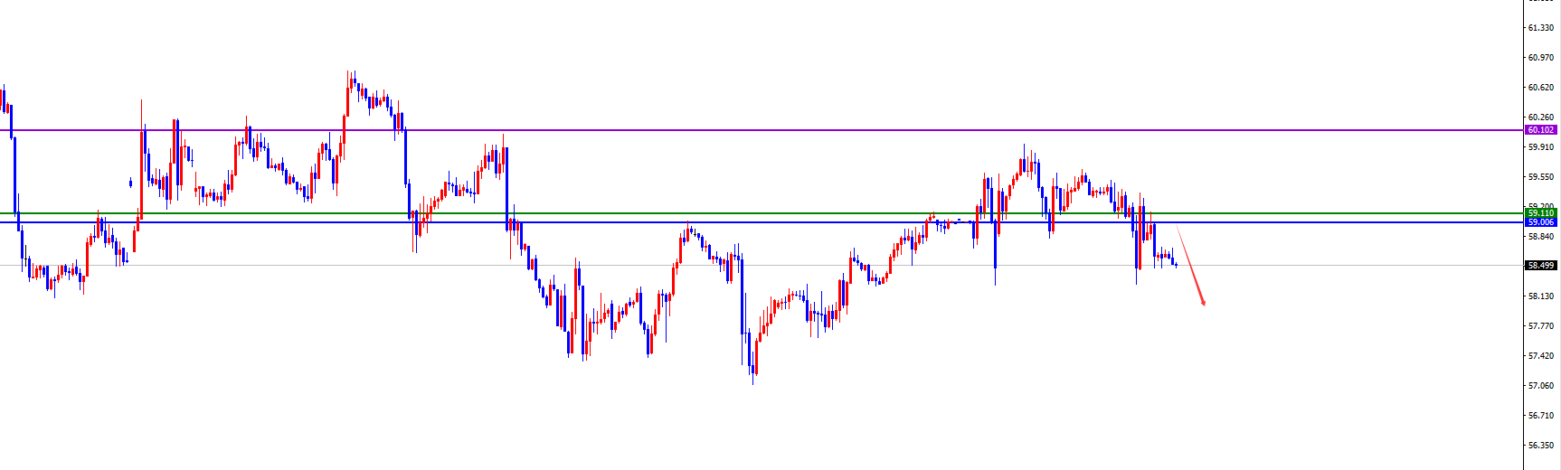 短线分水岭58.90-59区间,价格没有出现反转之前依此位置看承压