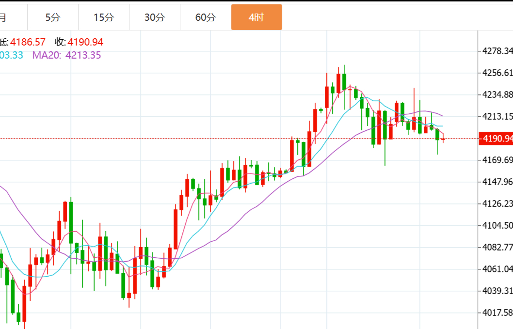 今日亚盘确定4216区域下跌破4195渠道4187,午后确定4199阻力又破低点去到4175