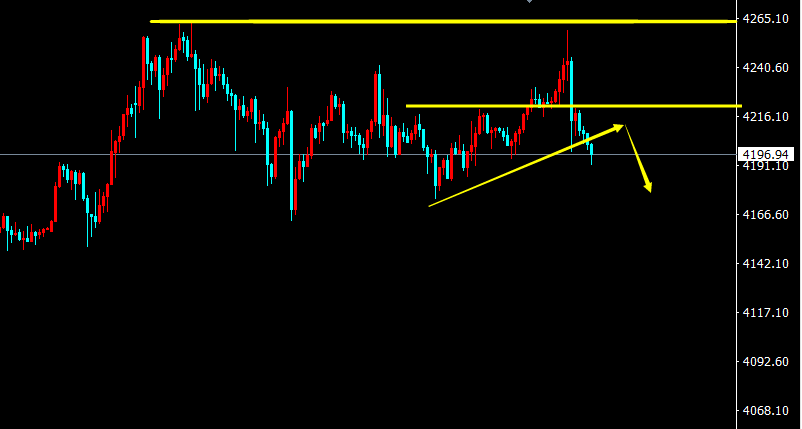 【周一操作】:黄金周一如先反抽于4215-18附近做空,目标看4195-80附近,损4228.