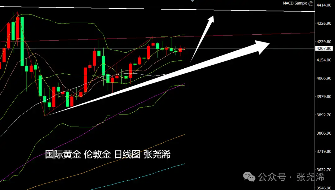 日图;金价目前保持震荡波动行情不变,日内走势又初步处于短期均线上方,多头占据一定优势,但方向暂仍不明,上方关注4265美元阻力能否突破持稳,来顺势继续看涨,下方关注中轨及30日均线支撑进行逢低看涨。