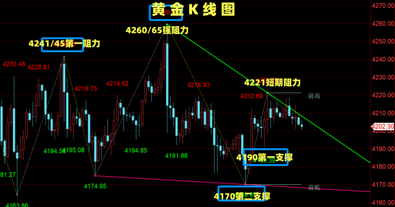 技术面:黄金日线连续收小阴小阳线,但价格重心没有下移,均线多头发散,中线依旧看涨。4小时周期呈现明显的箱体走势,整体保持上攻态势,短线继续上涨的概率很大!周二金价探底回升,四小时线收长下影,表明区间底部支撑强劲。今日可依托四小时级别反弹势能布局多单,方向明确后,于有效支撑位分批介入。当前价格仍在震荡区间内,日内重点关注日线5-10日均线支撑4200附近,下方4190为凌晨回撤低点,也是上涨结构关键防守位。可将4200-4190区域视为支撑带,观察企稳信号,若跌破则观望。晚间重点关注上方4241-4260美元一线压力,下方关注4190-4170美元一线支撑。个人预计:低多为主,高空为辅。GOLD分水岭:4200美元/盎司!