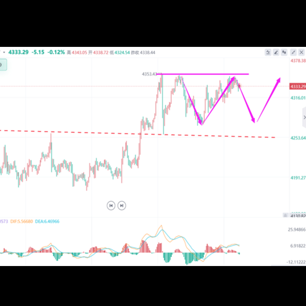 周一亚欧盘黄金直接上涨,最高在4350,接近上周五的4353,昨天全天下跌有70多美金,那么,可以下一个结论,黄金在4350形成了上方的双顶,在多头趋势下不破4350就不要过分看涨,很可能在此压制下看高位震荡表现。那么,今天可以继续做高空低多的交易。从技术面来看,日线周期,H4周期可能进入调整周期,特别是H4周期的变化,目前连阴下又在收口,继续发展的话,很有可能会在本周下跌一波至布林下轨之下4200附近,那么,链接到日线周期刚好就可以去布林中轨的强弱支撑点,所以,中长线黄金虽然明确看涨,但短期内的调整空间也需要关注。对于日内行情而言,亚欧盘看震荡,可以在关键点操作高空低多,大概率区间在4330-4250,可以选择在此区间交易,而美盘有非农数据公布,数据利多,再看4350,4385得失,数据利空,这波则要破位4250支撑点,再下看4200低点。目前手上有低位的空单和高位多单不知道如何处理,张德盛可解【张德盛微信号:macd60588 钉钉号:macd868 公众号:爱上黄金】