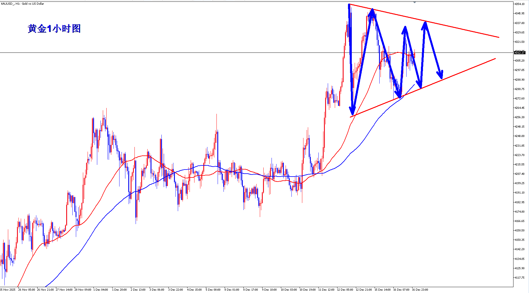 黄金1小时还是大区间震荡,不过黄金震荡的幅度开始收窄,如果黄金最终不能突破昨日的高低点,那么黄金1小时就开始走对称三角形的形态,那么黄金的震荡幅度可能会再次逐步收敛,最终寻求方向突破,黄金上方关注4242阻力,下方关注4280支撑,今天可以再区间内高抛低吸。