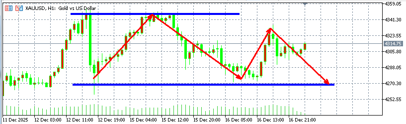 四小时线更明显,高点不断的下降,从4360下移到4340一线,再到4330附近,斜率也是明显的向下了,下方支撑在4290附近,一单击穿强支撑,金价又是暴跌,下方还是4260附近,也是这轮上涨的起点