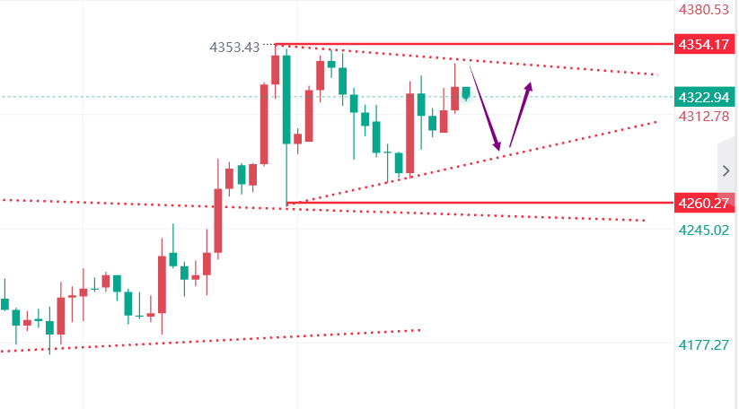 周一和周二的走势与我们周一所说的一致,最高触及4350,最低触及4270,也是完美符合我们的进场点。