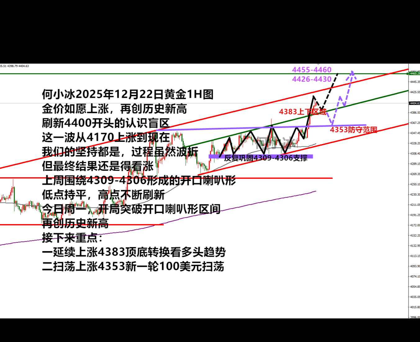 黄金开盘就是高开暴涨,一路上涨不回撤,4382的历史高点像是纸糊的一样轻松破位,小有震荡之后直接刷新新的历史高点4410一线,而兴言早盘其实是在4382-85一线提示了布局空单,可惜行情压根没有回撤,导致我们的空单也是折戟沙场,而目前行情则依旧是稳步抬升,那么当趋势是上涨,我们只能扭转思路跟随趋势了。