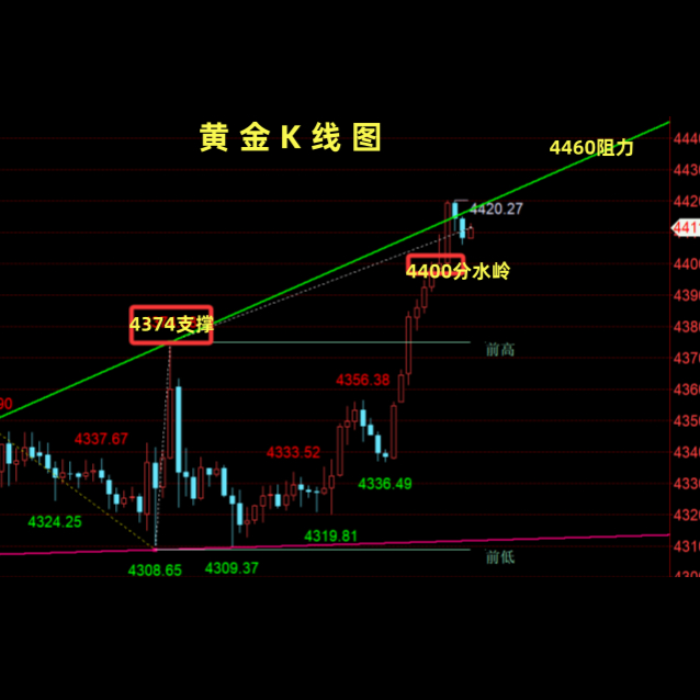 所以这两点综合发现的支撑点叠加在4384-4379区域,守住这里,整体趋势多头势能更足,往上再去看4426-4430区域,其次便是4455-4460范围