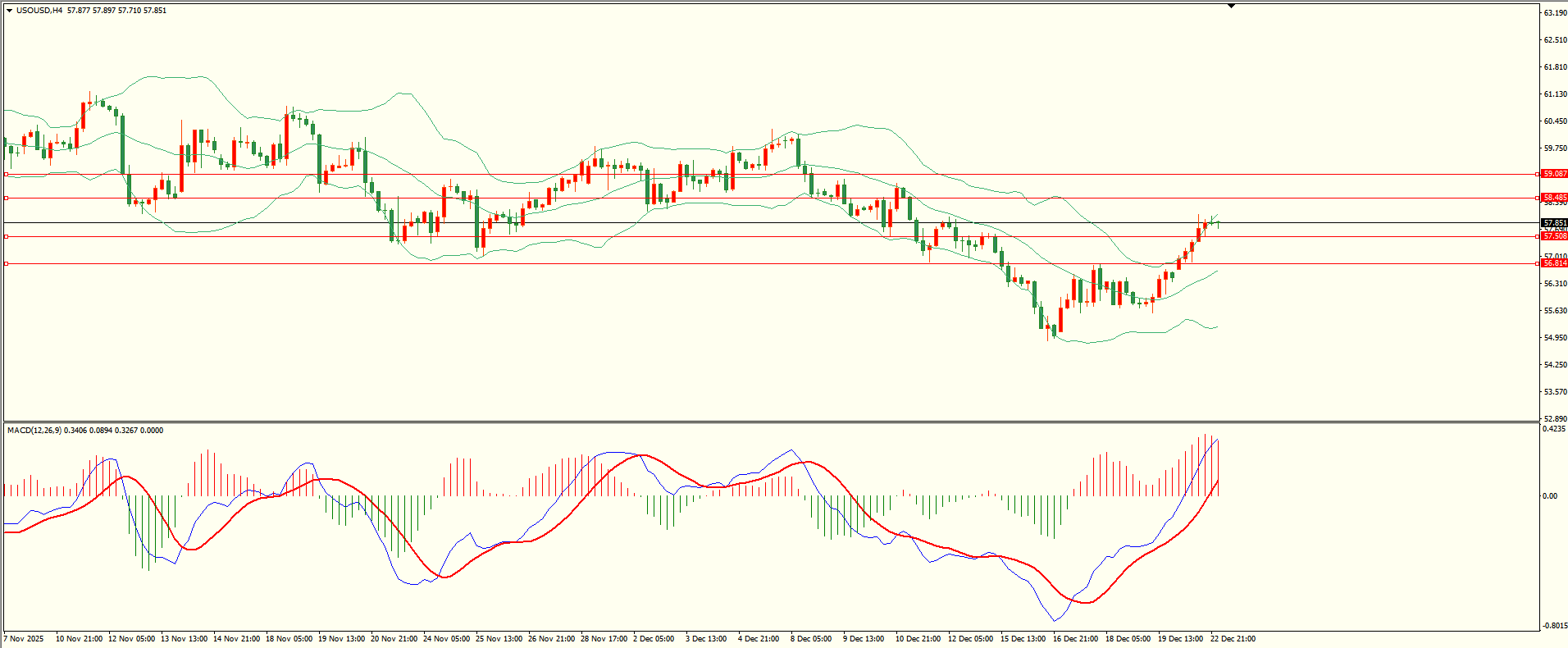 原油昨日亚市开盘后延续反弹,纽约盘时段触及第二阻力冲高回落,日线报收中阳线,布林上方依然面临日线布林中轨测试,收复后本轮反弹方可继续,从4H来看,布林中轨偏上,MACD零轴附近运行,日内下方首要支撑57.50,第二支撑56.80,上方阻力58.45,55.10,保持在第一支撑上方短线有望测试第一阻力。