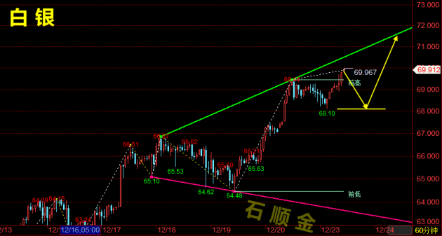 白银昨天大部分时间一直被压制在70美元,美盘突破70美元后短线遭打压一度跳水2美元,随后多头稳住局势和黄金一起企稳上涨,白银再破新高。今天71.5-72美元区域强弱分界,之上白银强势上涨;下破短线转弱,下方68.5-68区域重点支撑,一切回落不破这个区域和5及10日线都是多头,下破则需要警惕风险。