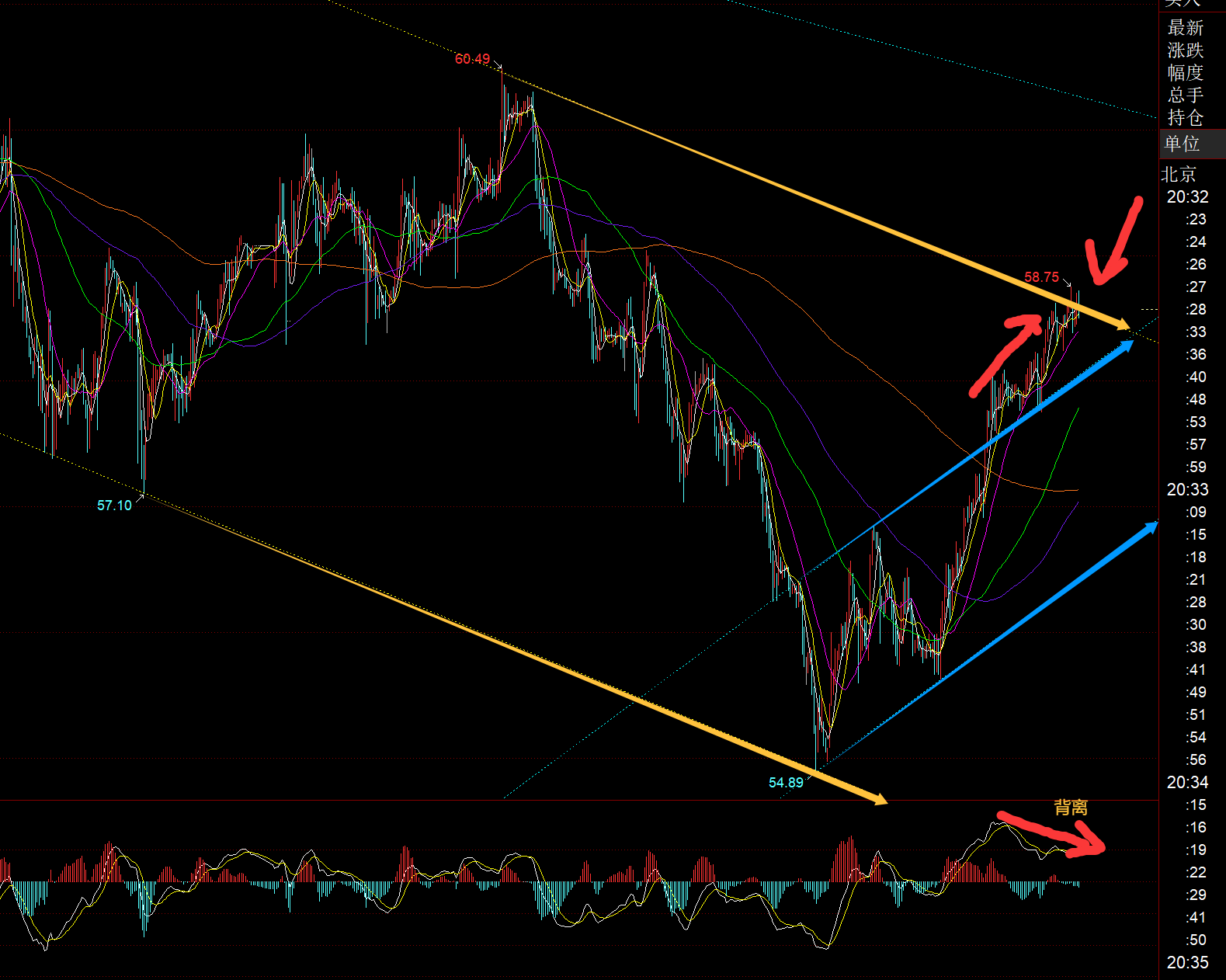 原油方面:昨晚上了市场的当,美盘出现一根大阴,吞没日内一天的涨幅,也失守小时线中轨,以为出受压信号,结果后半夜又洗回去;从现在新通道来看,整体还是处于下行通道内,不管是小时线周期,还是日线级别等,macd也开始顶背离,所以还需留意后面随时打压回落; 58支撑,58.7下阻力,以及59.6下阻力,等承压;