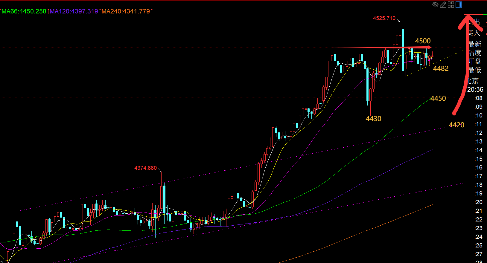 第一,黄金方面:昨日早间直接拉升,单边趋势,早起都有肉吃;午后和欧盘依托4470上、4482上反复看涨,也反复试探4493,逼近4500下压力目标;而美盘再依托4476上看涨,出现一波急跌洗了下,后半夜企稳4430又连阳V拉升回到4500关口,收盘于相对高位,停盘前就直接提示,今天一早开盘可以直接继续博续涨,胆大才能吃肉,强势趋势单边不光靠技术,也靠胆量,做好风控即可,4490直接看涨,4520-30到位;