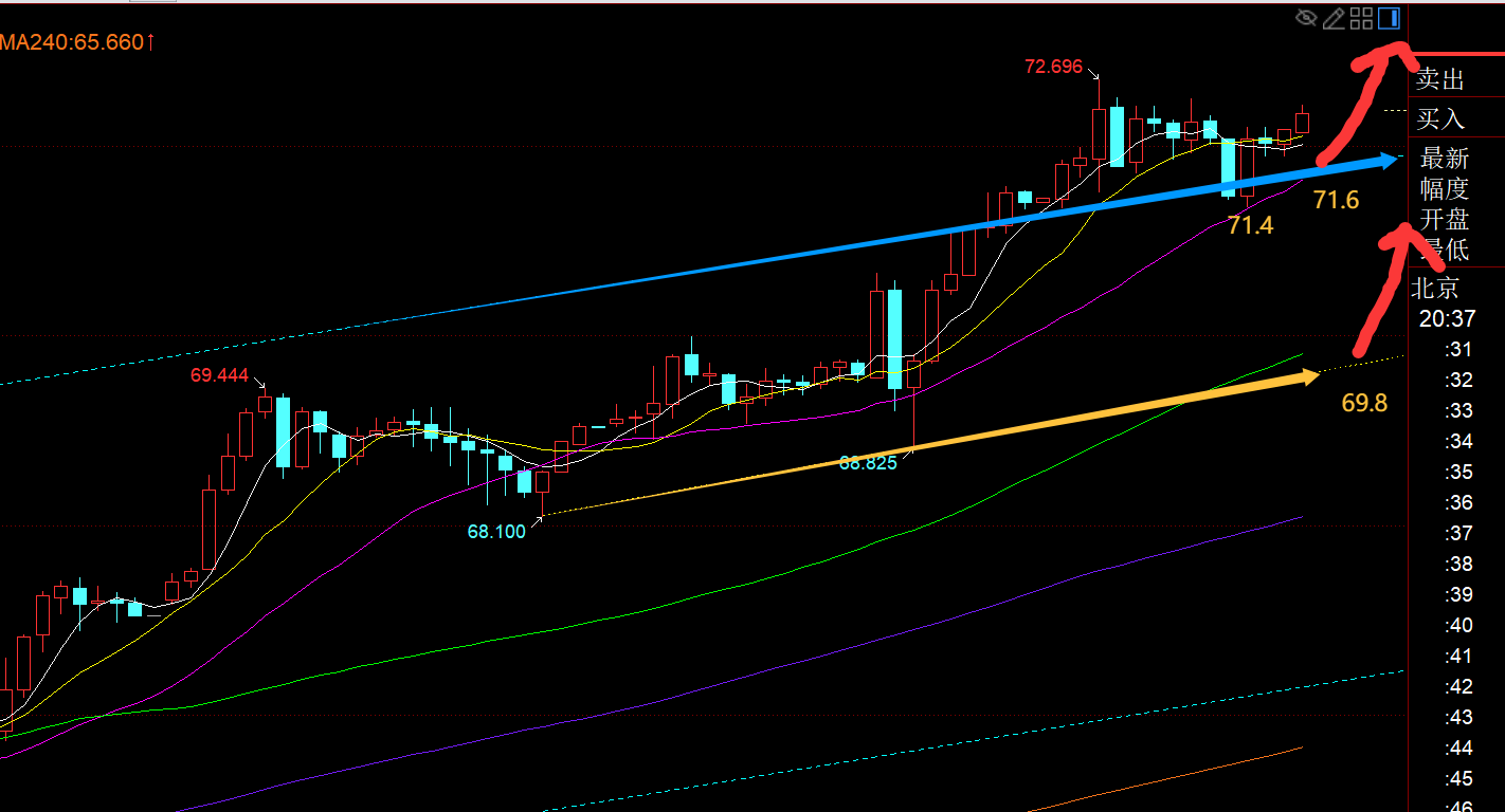 第二,白银方面:牛市依旧继续,疯狂仍在持续,只多不空原则继续遵守;昨日继续看涨,最终是抵达了70及上方目标;