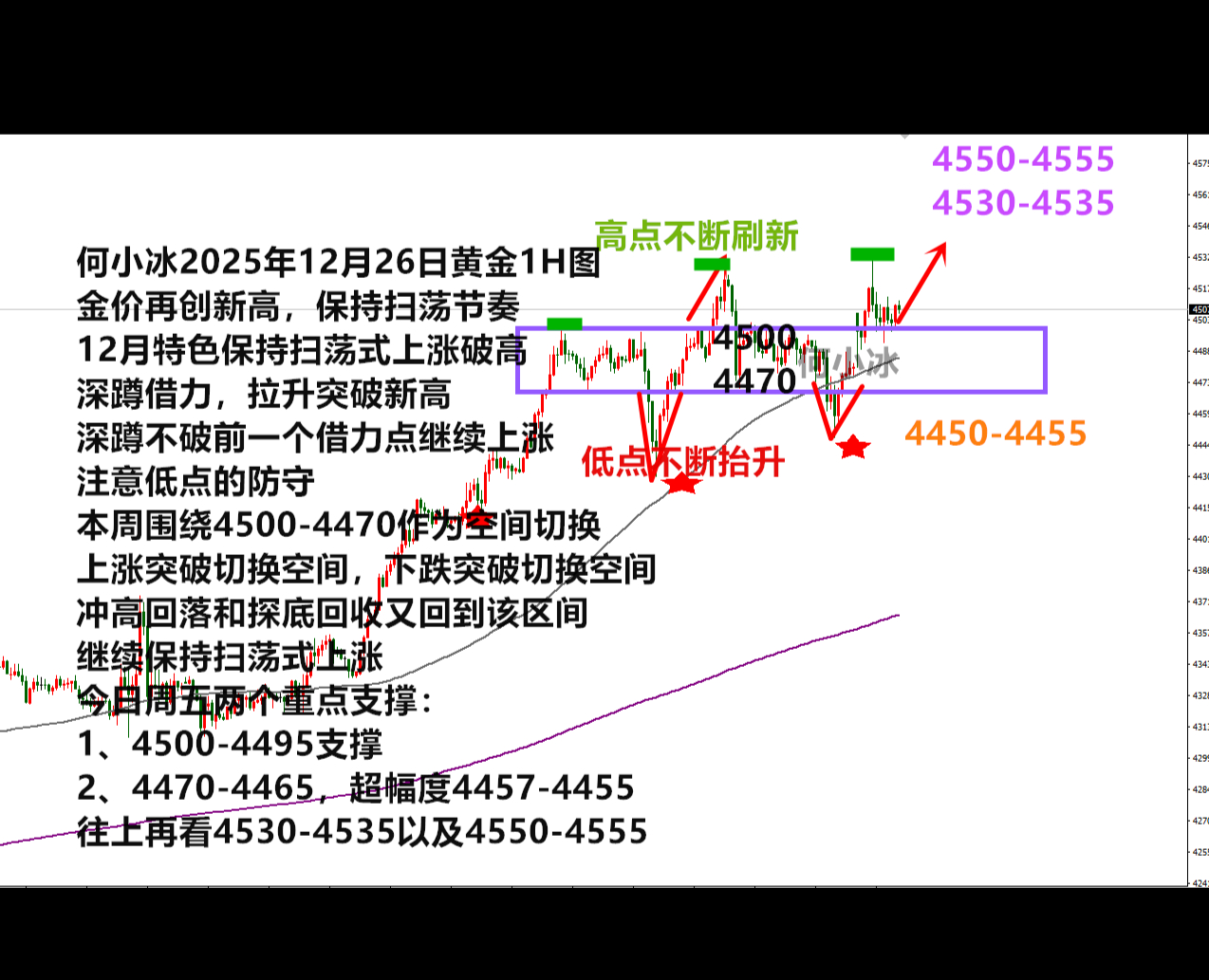 上交易周四因圣诞节停盘,回顾前交易日周三(12月24日):国际黄金震荡十字收线,有反弹见顶看空的预期,其走势在突破4500美元关键关口,创下4525.42美元的历史新高后,在圣诞假期前获利了结回吐涨幅,未能持稳;这为短期走势增添了见顶回调的预期;