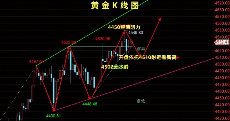 技术面:从周六凌晨收盘走势来看,黄金下探4510后迅速反弹,冲高4550后小幅回踩,多头趋势未改,反弹动能充足。目前金价站稳上升通道上轨,依托5日线有望继续走强,但是由于市场交易情绪的影响,小周期内不建议去追高,需要重点关注4550位置,金价只要不破该位置黄金有望迎来技术上的调整,下方支撑在4500位置,跌破该位置黄金下行即还有空间,4H走势整体震荡偏多,均线系统保持向上发散的态势,布林带出现收口迹象,价格波动区间有所收窄;MACD指标运行于零轴上方,多头动能释放节奏温和,并未形成明确的死叉转空信号。开盘重点关注上方4560-4585美元一线压力,下方关注4510-4490美元一线支撑。个人预计:低多为主,高空为辅。GOLD分水岭:4505美元/盎司!