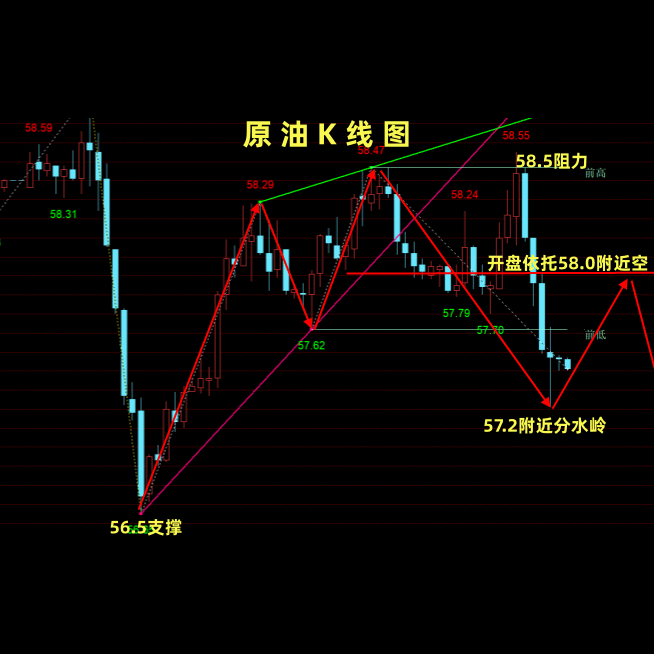 多单:激进57.0±0.2区间,稳健56.6±0.2区间,止损‌:各0.6左右,目标位‌:58.0附近!
