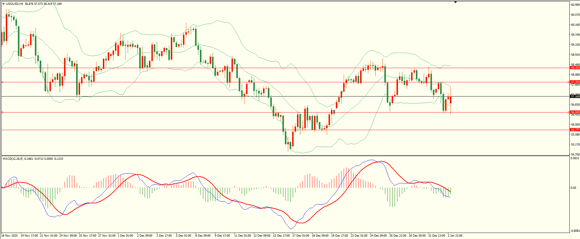 原油上周五反弹至第一阻力承压下行,盘中回落至第一支撑展开反弹,日线报收上下影线小阴线,目前下方紧邻前支撑,下破后方可继续,从4H来看,布林中轨偏下,MACD零轴附近运行,日内上方首要阻力57.75,第二阻力58.35,下方支撑56.50,55.75,保持在第一阻力下方短线有望回测第一支撑。