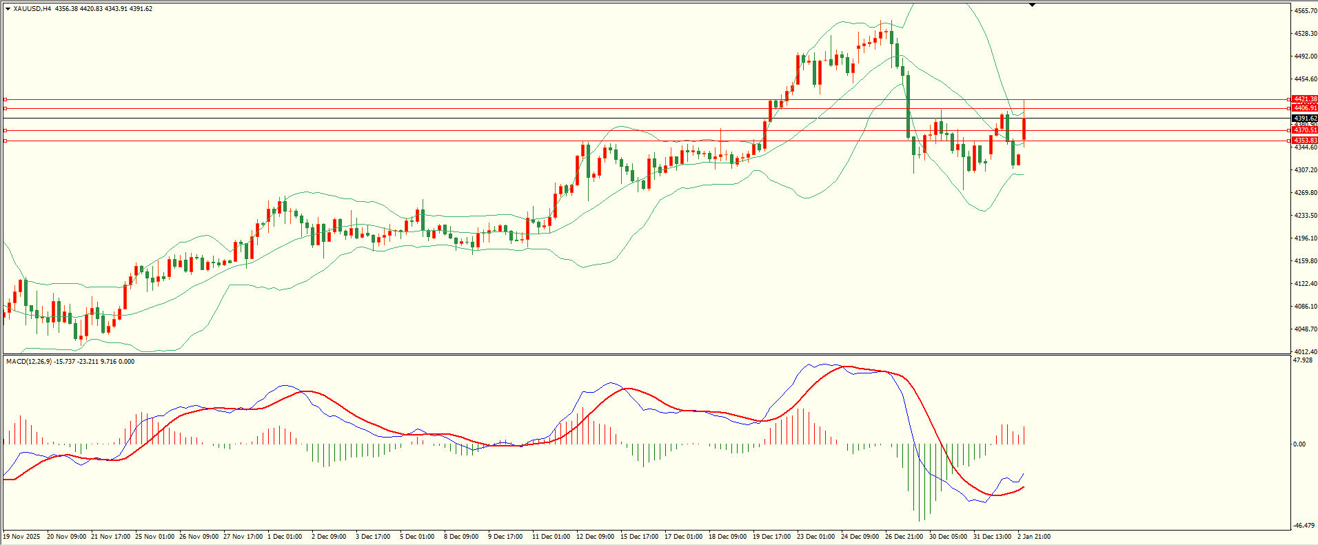 黄金上周五先扬后抑,至收盘回落至第一支撑略有缓和,日线报收十字星线,从收盘来看,下方支撑并未失守,同时上方阻力犹存,短线预防震荡再现,结合4H来看,布林中轨略有拐头,MACD零轴下方运行,日内下方首要支撑4370,第二支撑4352-53,上方阻力4406,4421-22,第一支撑在没有失守前短线有望回测第一阻力。