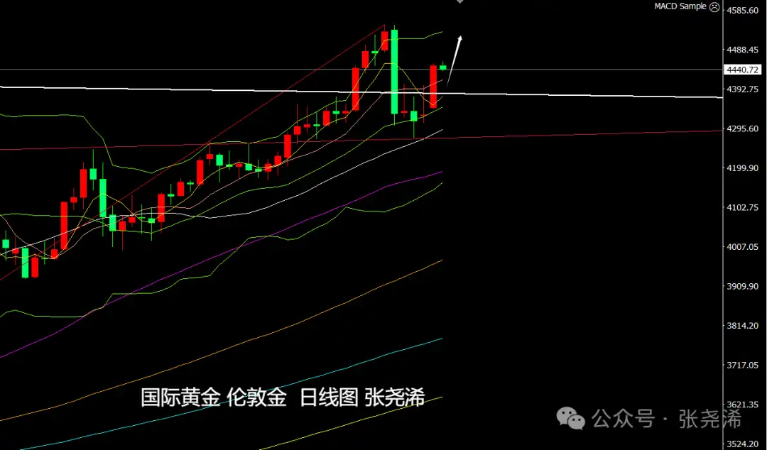 具体走势上,金价自亚市高开于4346.46美元/盎司,并先行录得日内低点4344.06美元,之后持续回升走强,虽自欧盘触及4440附近明显回撤40多美金,但最终多头再度发力,于美盘初收复回撤跌幅,并录得日内高点4455.48美元,最终持稳盘整于4440美元上方,并收于4448.83美元,日振幅111.42美元,相对于上周五收盘价4328.35美元,收涨120.48美元,涨幅2.78%。
