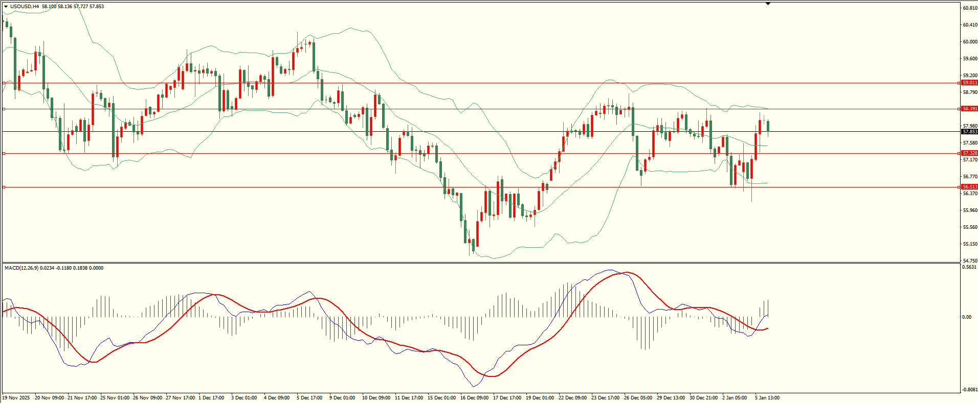 原油昨日回调至第一支撑震荡上行,至收盘触及第二阻力附近冲高回落,日线报收中阳线,收盘位置触及前阻力,在没有收复前谨慎追涨,从4H来看,布林中轨略有走平,MACD零轴附近运行,日内下方首要支撑57.35,第二支撑56.50,上方阻力58.35,59.00,保持在第一支撑上方短线有望测试第一阻力。