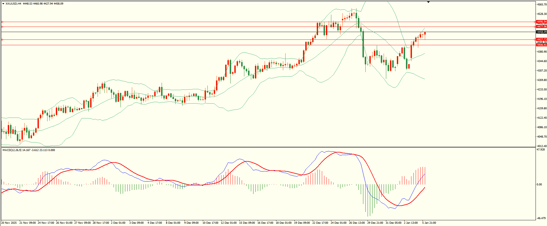 黄金昨日亚市开盘后延续走高,尾盘时段触及前阻力涨势缓和,日线报收大阳线,从收盘来看,多头格局保持,结合4H来看,布林中轨拐头向上,MACD零轴附近运行,日内下方首要支撑4426-27,第二支撑4406,上方阻力4477-78,4496-98,第一支撑在没有失守前短线有望测试第一阻力。