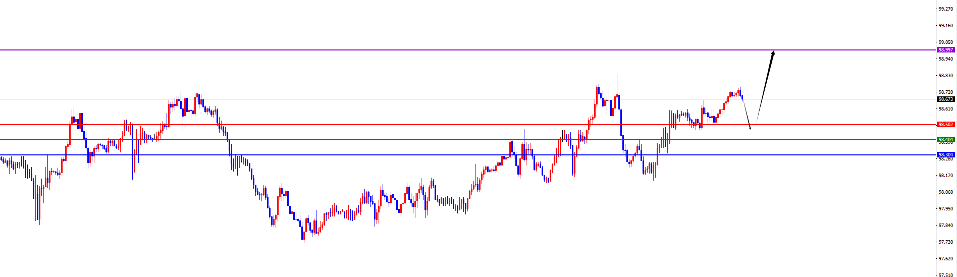 短线关键分水岭98.40-50区域,价格没有出现反转信号前看多