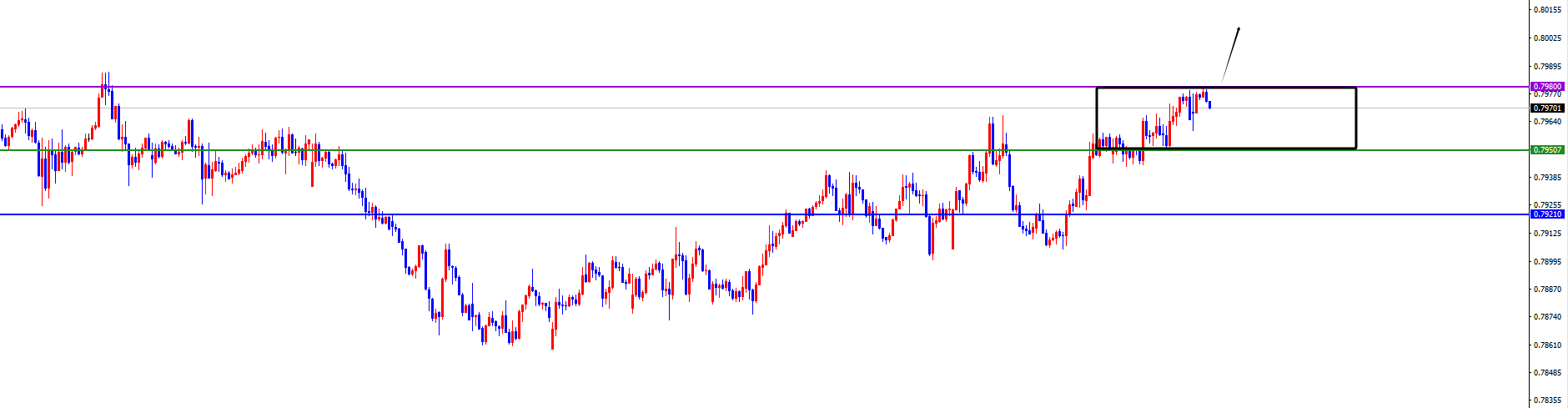 关键分水岭0.7940-50区域,价格没有出现反转信号之前维持多