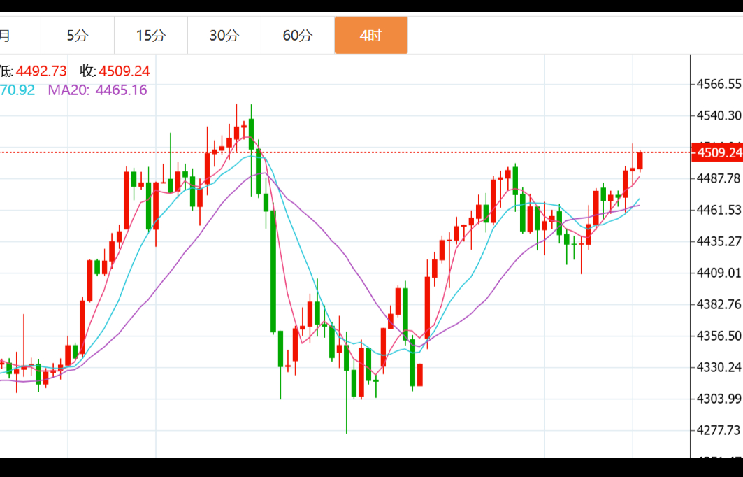 而目前行情在早盘先跌后涨之后,当前价格在4470一线,兴言还是早盘提到的4482阻力位,触及仍可短线先空一次,思路上暂时不做改变.