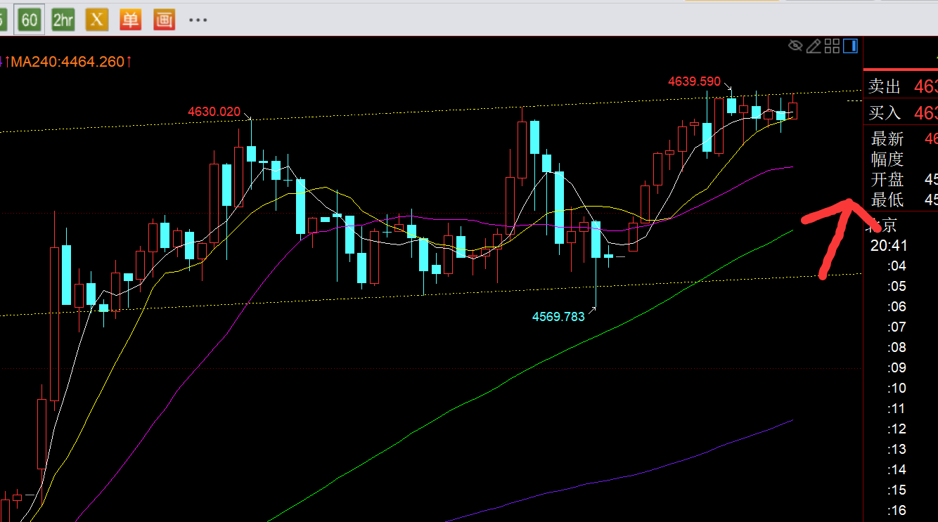 第三,黄金小时线级别:隔夜成功试探4573支撑后,今日开盘直接一路北上拉升,一路冲到最高4639一线,也是图中箱体通道上轨,4640下已多次承压,今晚关注它的得失情况;若冲破可能还会延续空间,但容易冲高回落;理想走势是倾向于向下打压一波,维持高位整理,再触及通道下轨4580-4570支撑稳定再进行明日的拉升;高位反复区间整理之后,再继续日线进一步的上破发展,然后周五尾盘要小心会不会出现获利盘;因此,今晚先留意4640下阻力,若上破则留意日线4675下阻力,支撑4580-4570,中间尽量多看看,卡两边即可,总体上仍维持北上为主不变,跟随大趋势;
