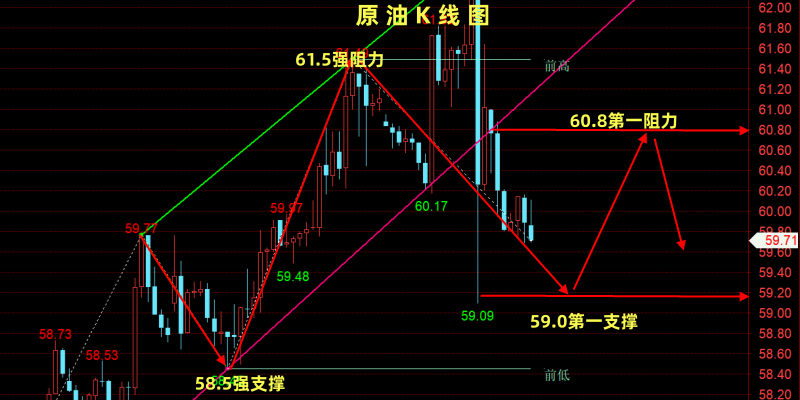 多单:激进59.5±0.2区间,稳健58.7±0.2区间,止损:各0.6左右,目标位:61.8附近!