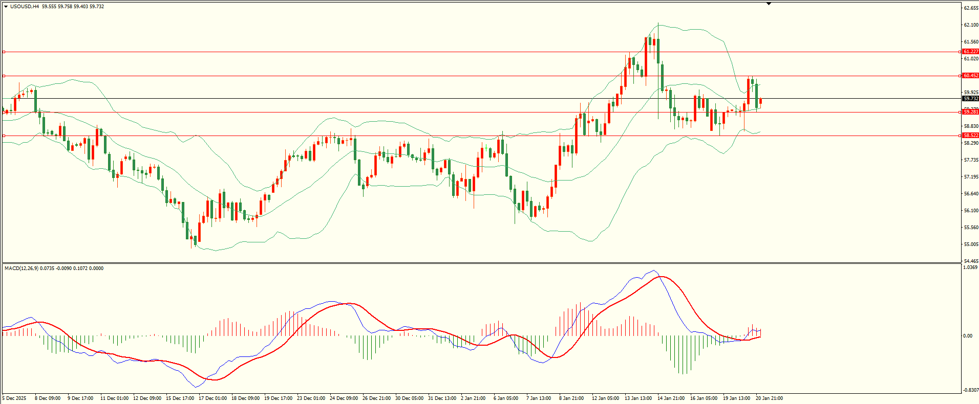 原油昨日回调至第一支撑展开反弹,盘中触及第一阻力上方冲高回落,日线报收小阳线,支撑与阻力并存,短线的多空震荡尚未结束,从4H来看,布林中轨偏上,MACD零轴附近运行,日内下方首要支撑59.25,第二支撑58.50,上方阻力60.45,61.20-30,保持在第一支撑上方短线有望回测第一阻力。