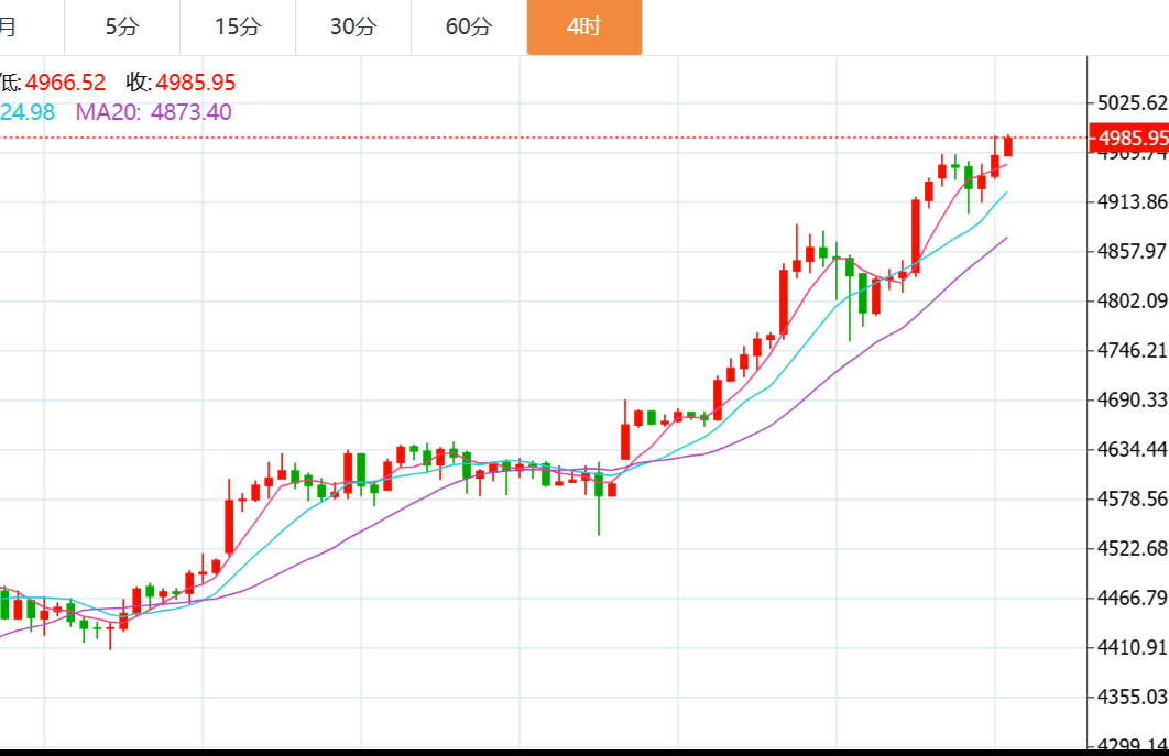 具体走势上,金价自亚市开于4764.09美元/盎司,先行走强,于9点时段突破4800美元关口,并连续反弹至14点时段触及日内高点4887.76美元并遇阻,欧盘时段再度横盘整理,美盘时段持续回落走低,于盘尾时段,一度跳水转跌,录得日内低点4755.84美元,最终反弹回升再度走强,收于4830.99美元,日振幅131.92美元,收涨66.9美元,涨幅1.4%。