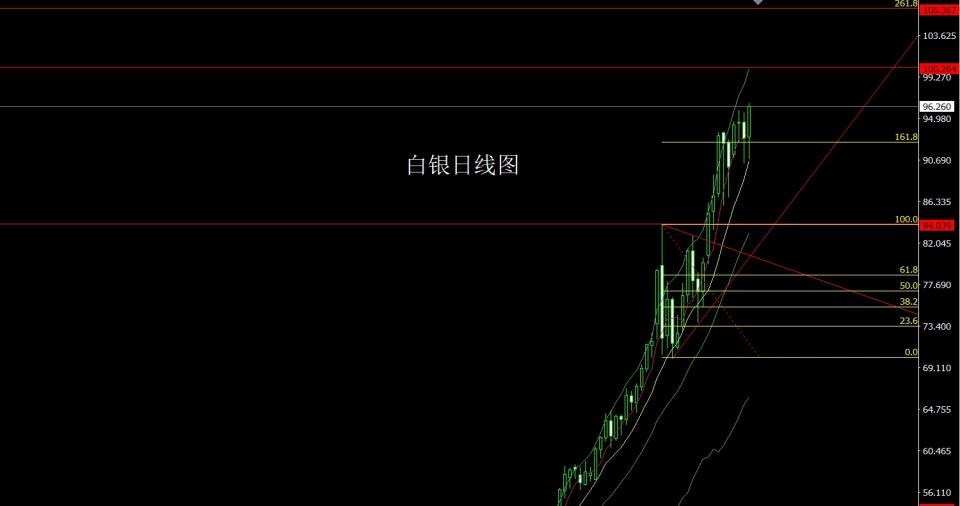 白银市场昨日开盘在91.052的位置后行情先回落,日线最低给到了90.723的位置后行情强势拉升,日线最高触及到了96.656的历史新高后整理,日线最终收线在了96.176的位置后,日线以一根下影线极长的大阳线收线,而这样的形态收尾后,日线阳包阴,今日的行情回踩多,点位上,下方37.8的多和38.8的50.75的多和52.7的多减仓后止损跟进在82,今日94.5多止损94.2,目标看96和96.7和97.5和98.